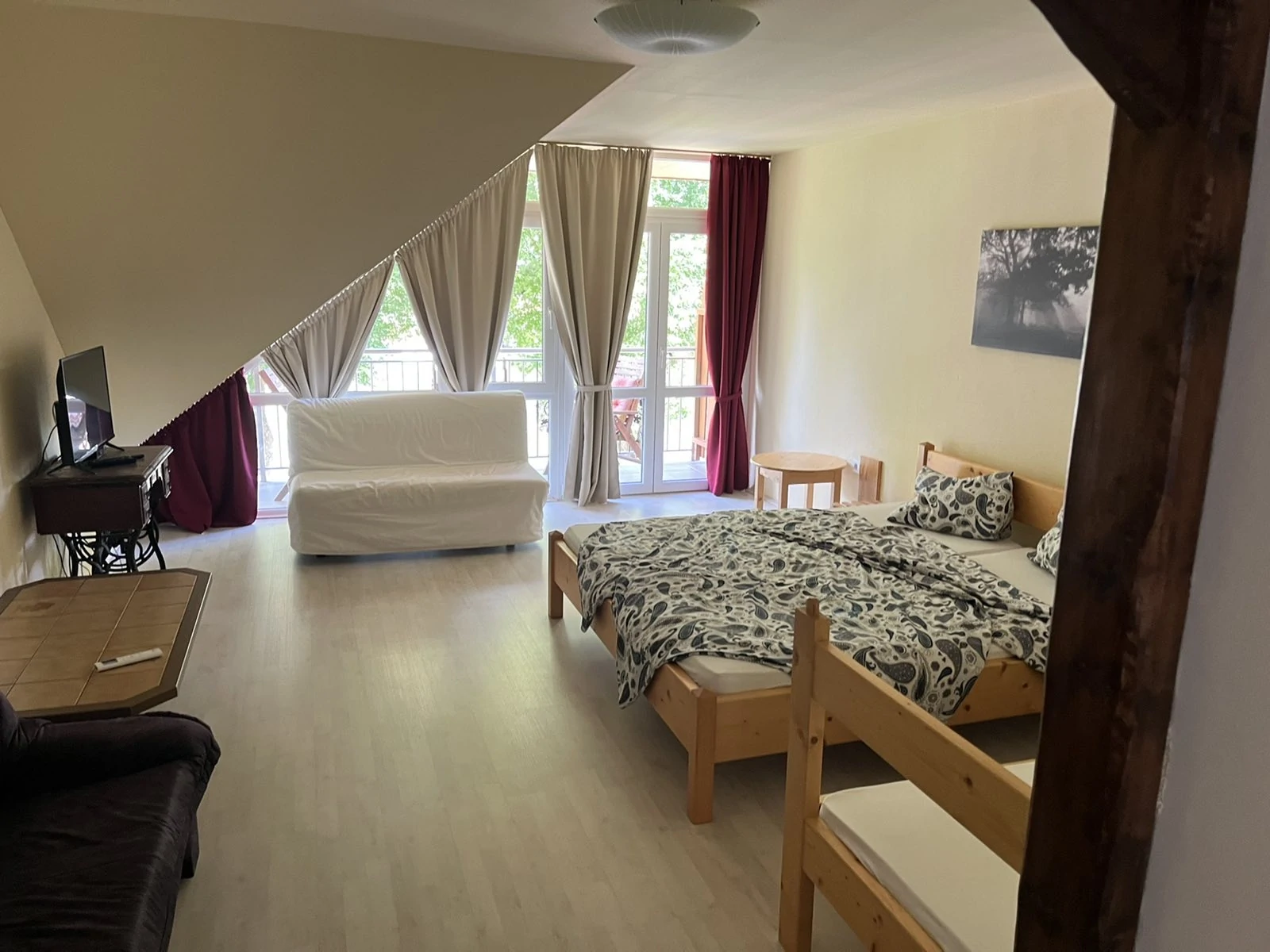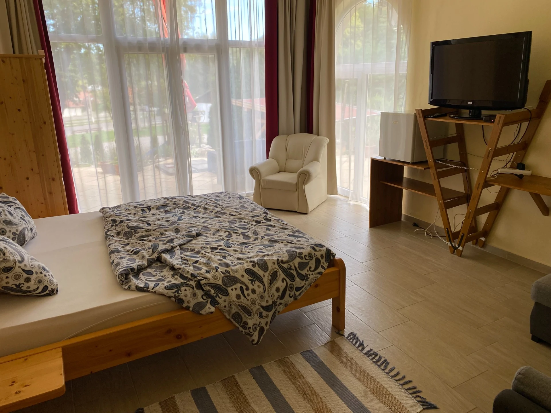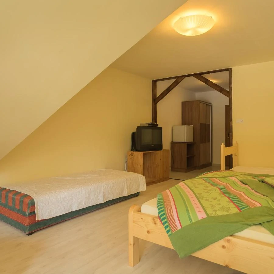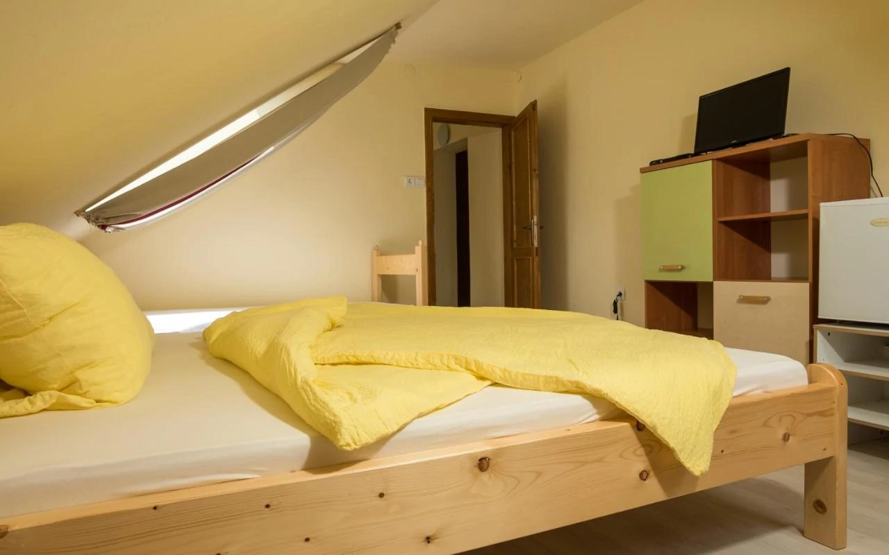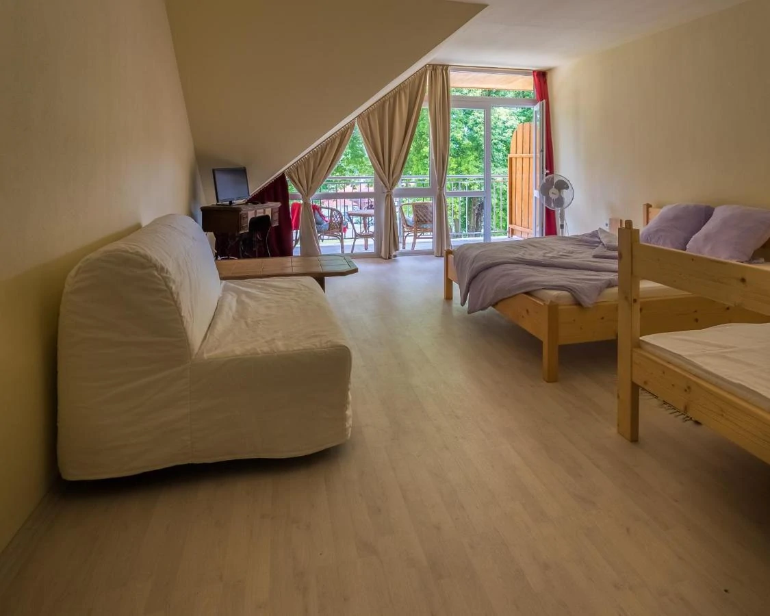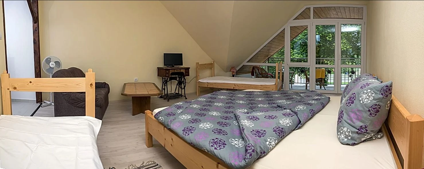 9 szoba van, 3-4-5 ágyasak, franciaágyak, egyszemélyes ágyak, és kihúzható kanapék. Minden szobához tartozik saját fürdőszoba, van mindenhol hűtő, wifi is van, és mindegyik szobában TV.
